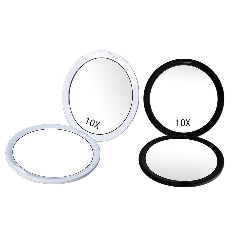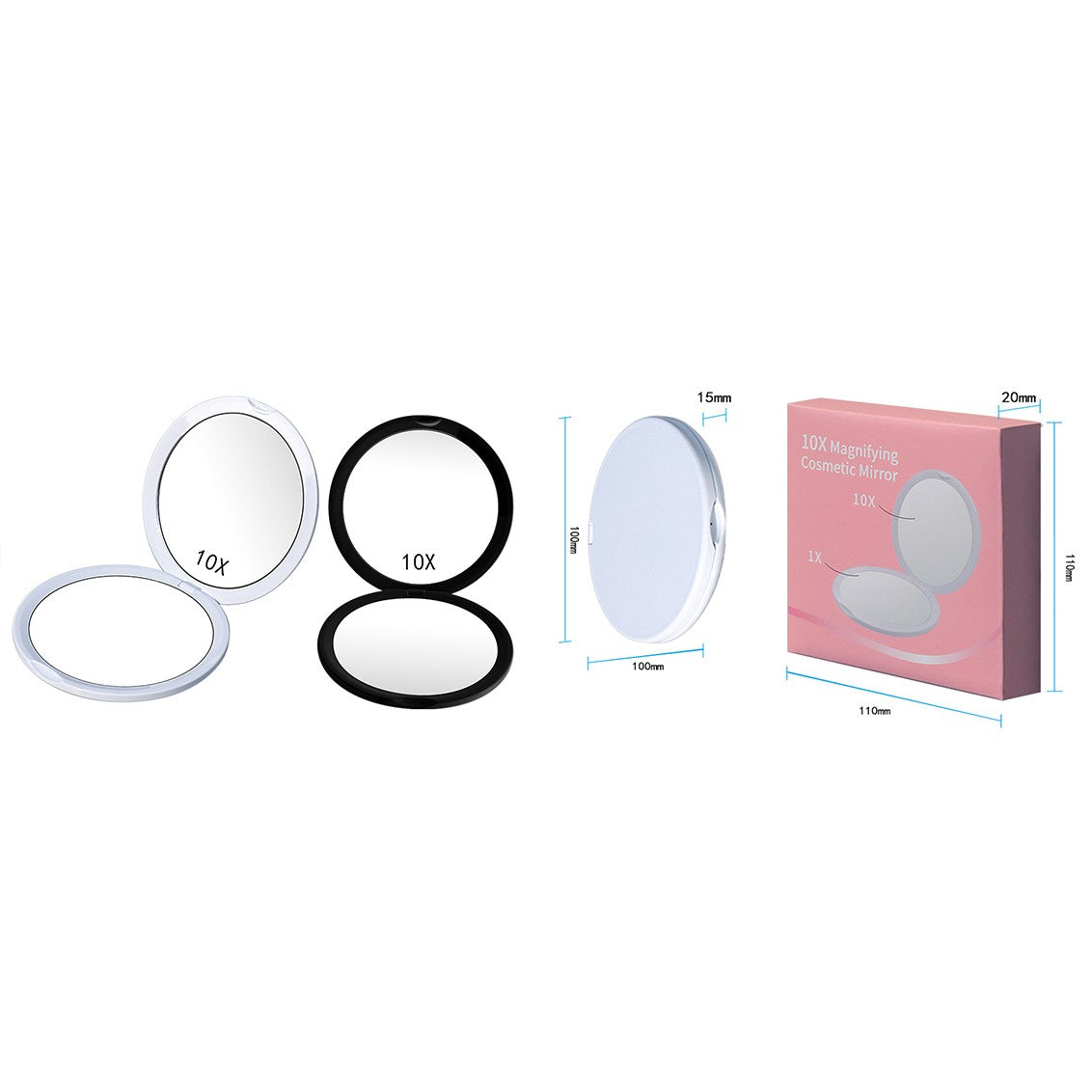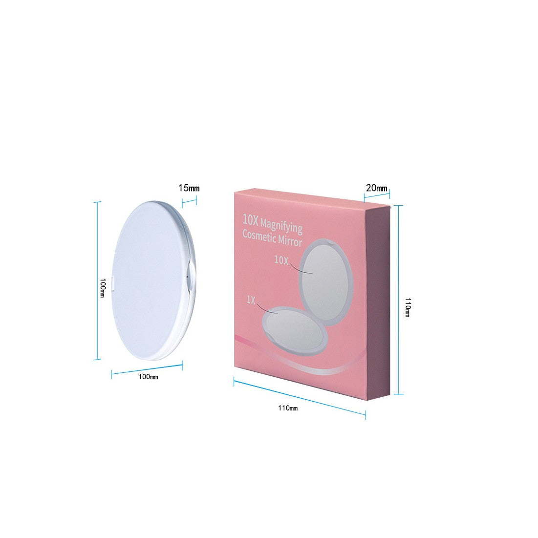 This Mirror is made of ECO friendly thickened ABS plastic. which is beautiful in shape, light in weight and safe to use. It is suitable for everyone who likes beauty and personal care. Mirror is very easy to pack and carry, is the perfect addition to be used as a hand mirror, tabletop mirror, travel mirror. It has a 2-sided mirror that one side is the1 time and the other side is 10 times magnifying mirror. 3.94" Diameter x 0.59" Thick