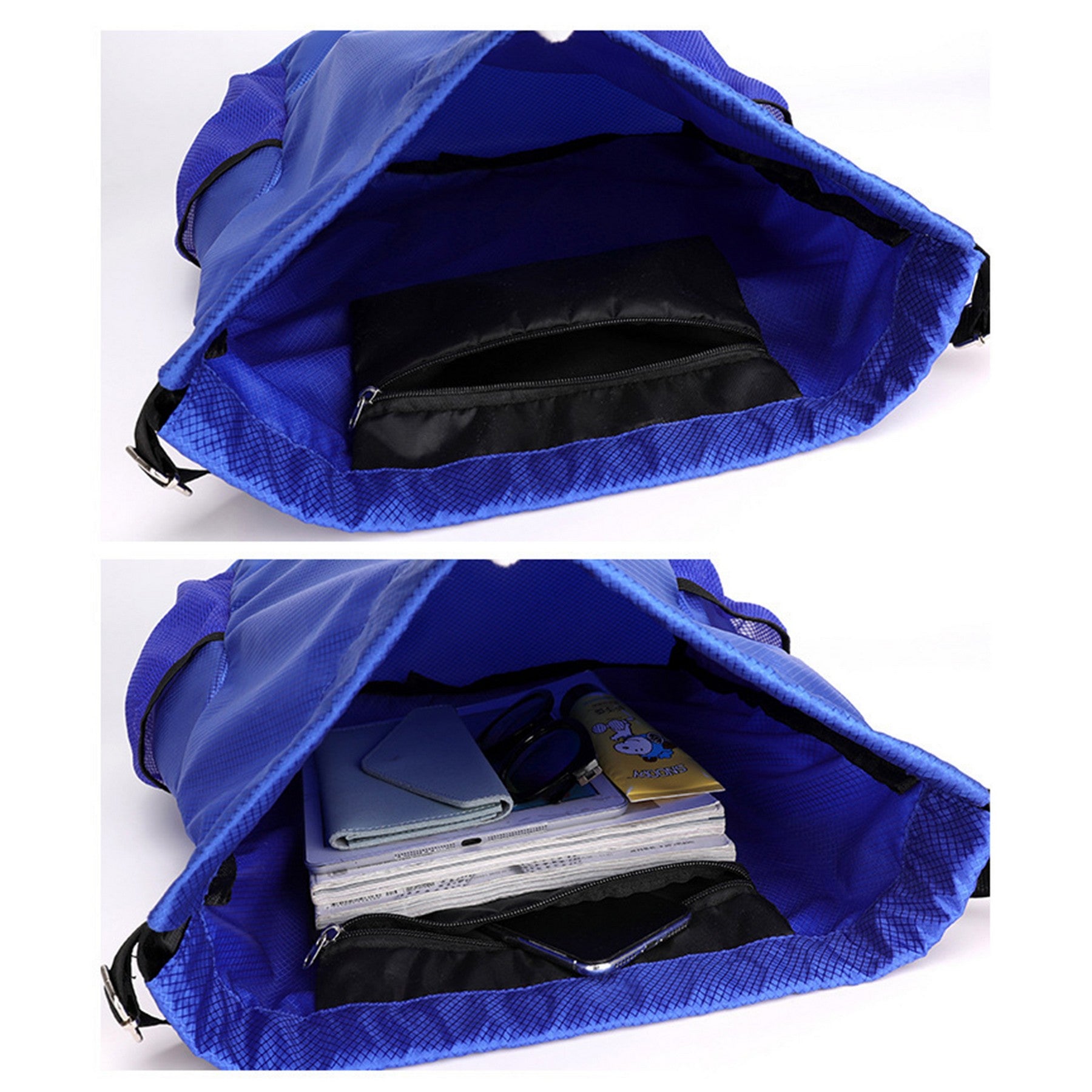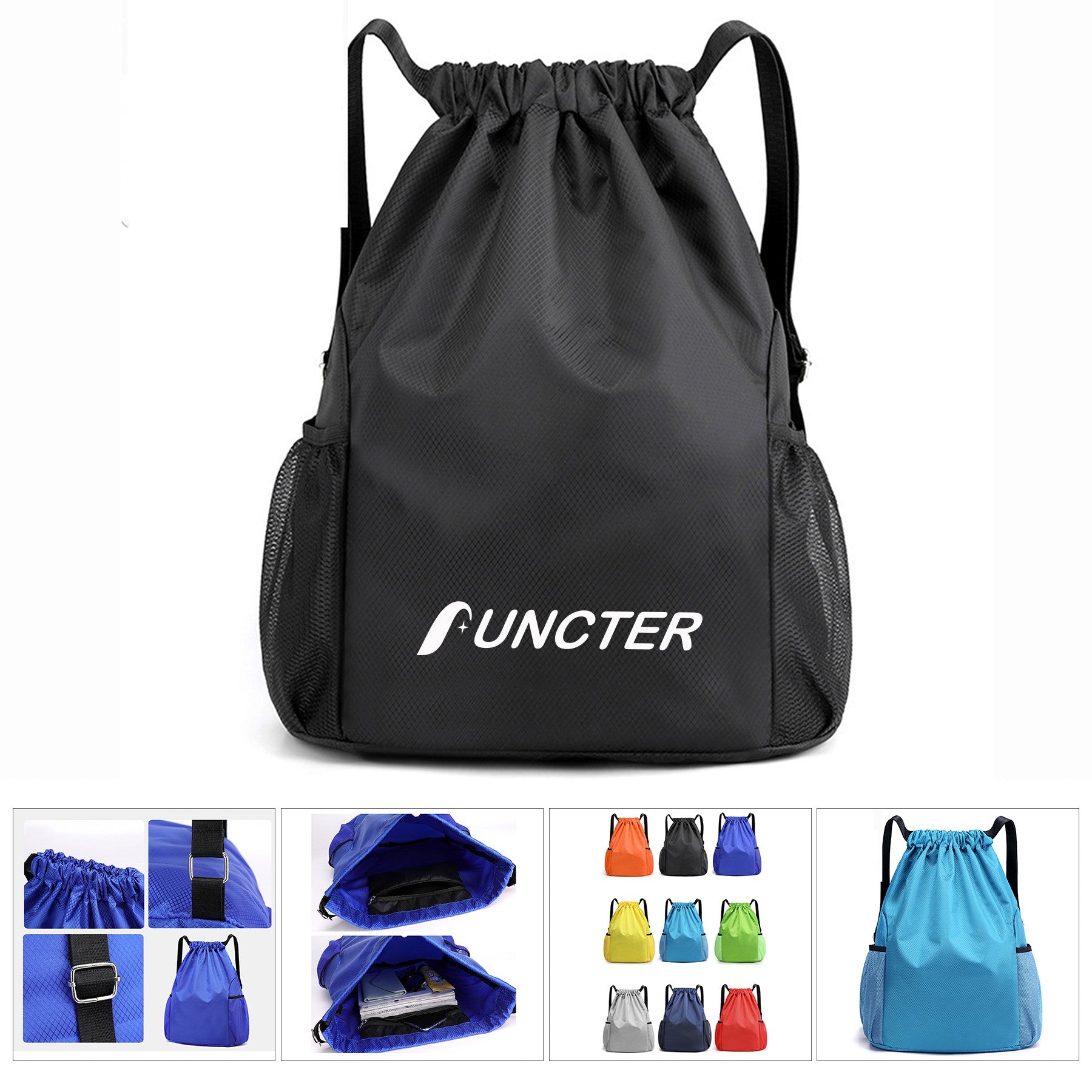 The drawstring backpack is made of high-quality Oxford cloth and reliable polyester inner lining, which is durable, wear-resistant and tear-resistant, breathable and quick-drying, and the waterproof fabric keeps the items inside dry. The sports backpack has 2 mesh side pockets on the outside, which can be used to place water glasses and umbrellas, and there is a zipper pocket on the inside for small items, and the main bag can hold football, gym clothes, sports towels, textbooks...