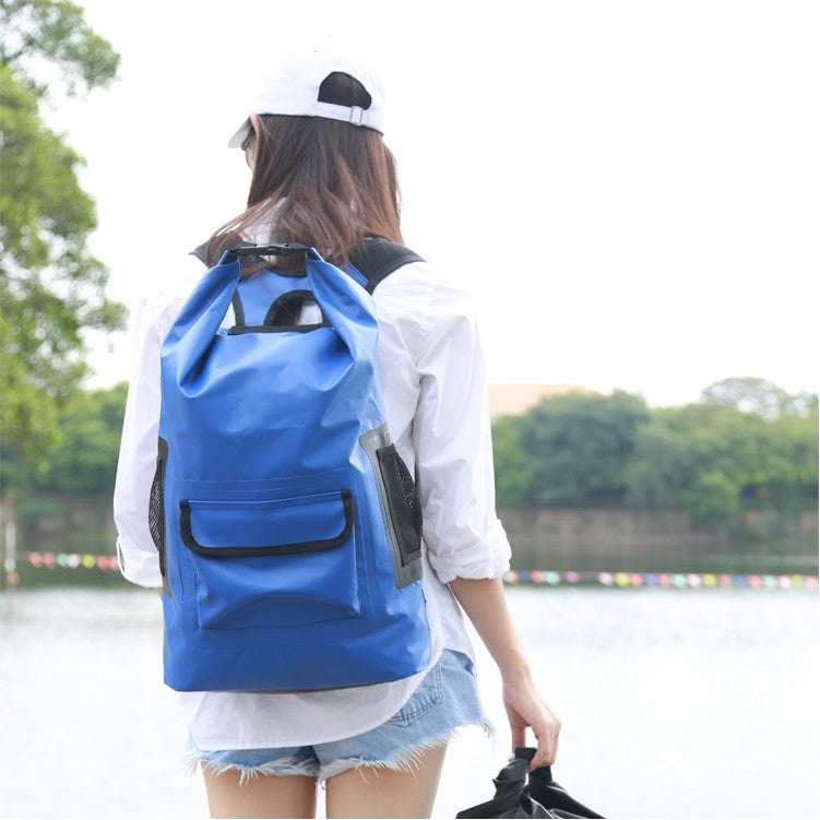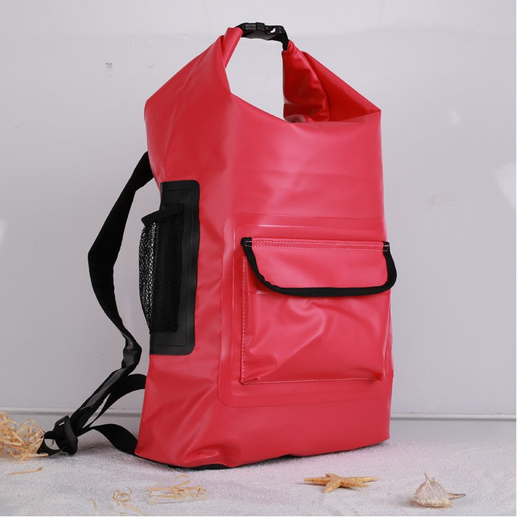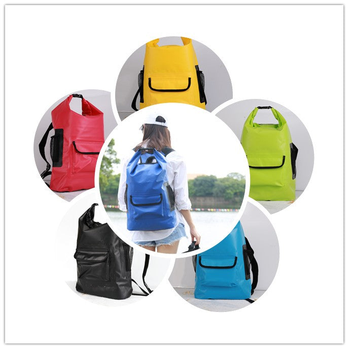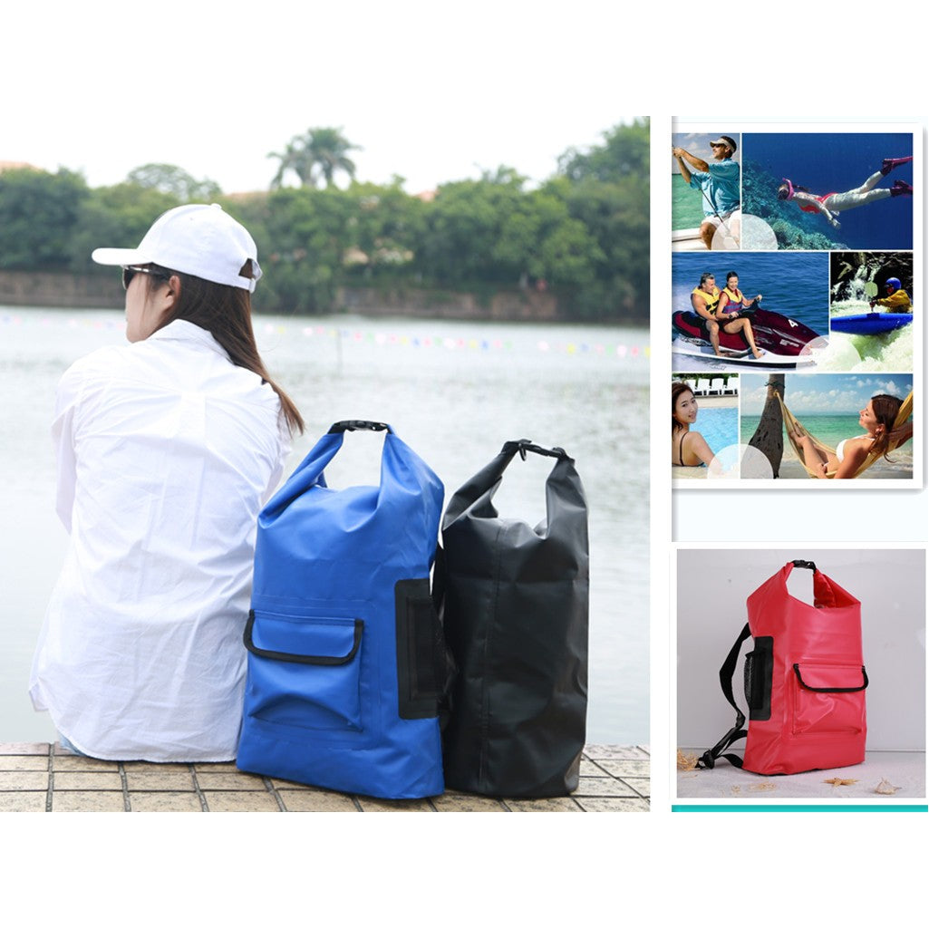 This sports backpack is made of extra heavy duty tarpaulin PVC and is 100% waterproof. It is suitable for quick submersion, protects valuables from dirt, dust, sand and water. An adjustable shoulder strap is included. It can be carried on shoulder or by hand. People can take it to camping, rafting, swimming and travel. It has a capacity of 20 L. 24" H x 12 1/2" W x 5 1/2" Thick