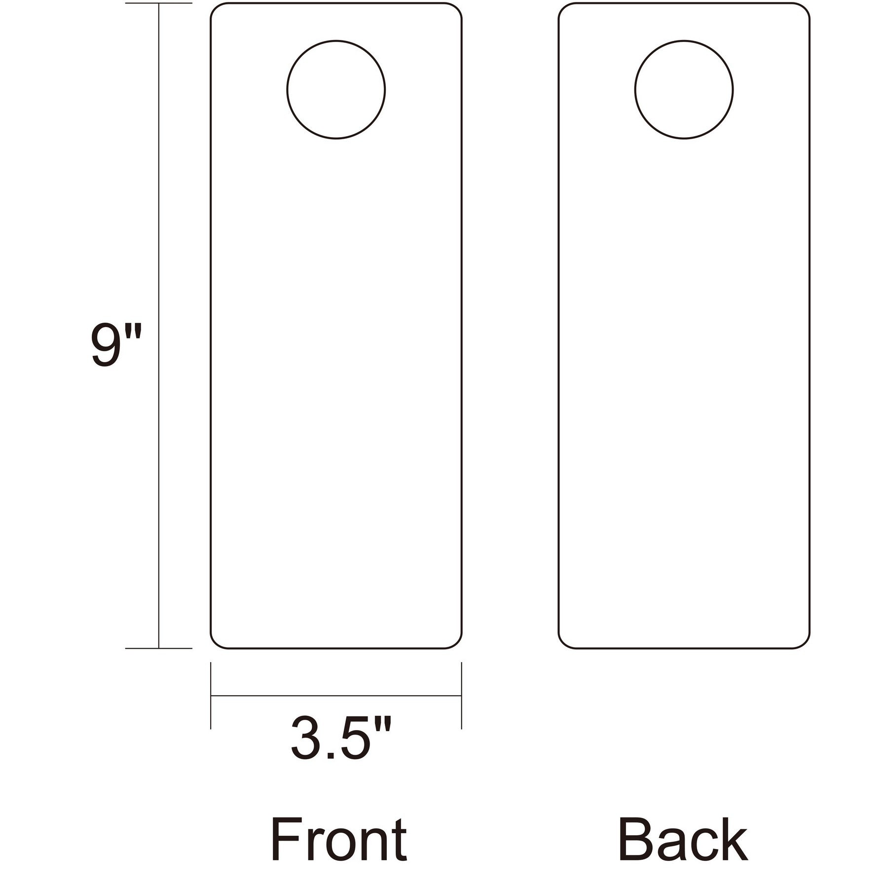 This door hanger is made of PVC. We can place custom logos on both sides, add your organization or company logo, emblem, or message. It's a great item for in-home or office use, or to leave business hours, menus and other important information. Complies with Prop 65. 3.5" W x 9" H x 0.76mm Thick