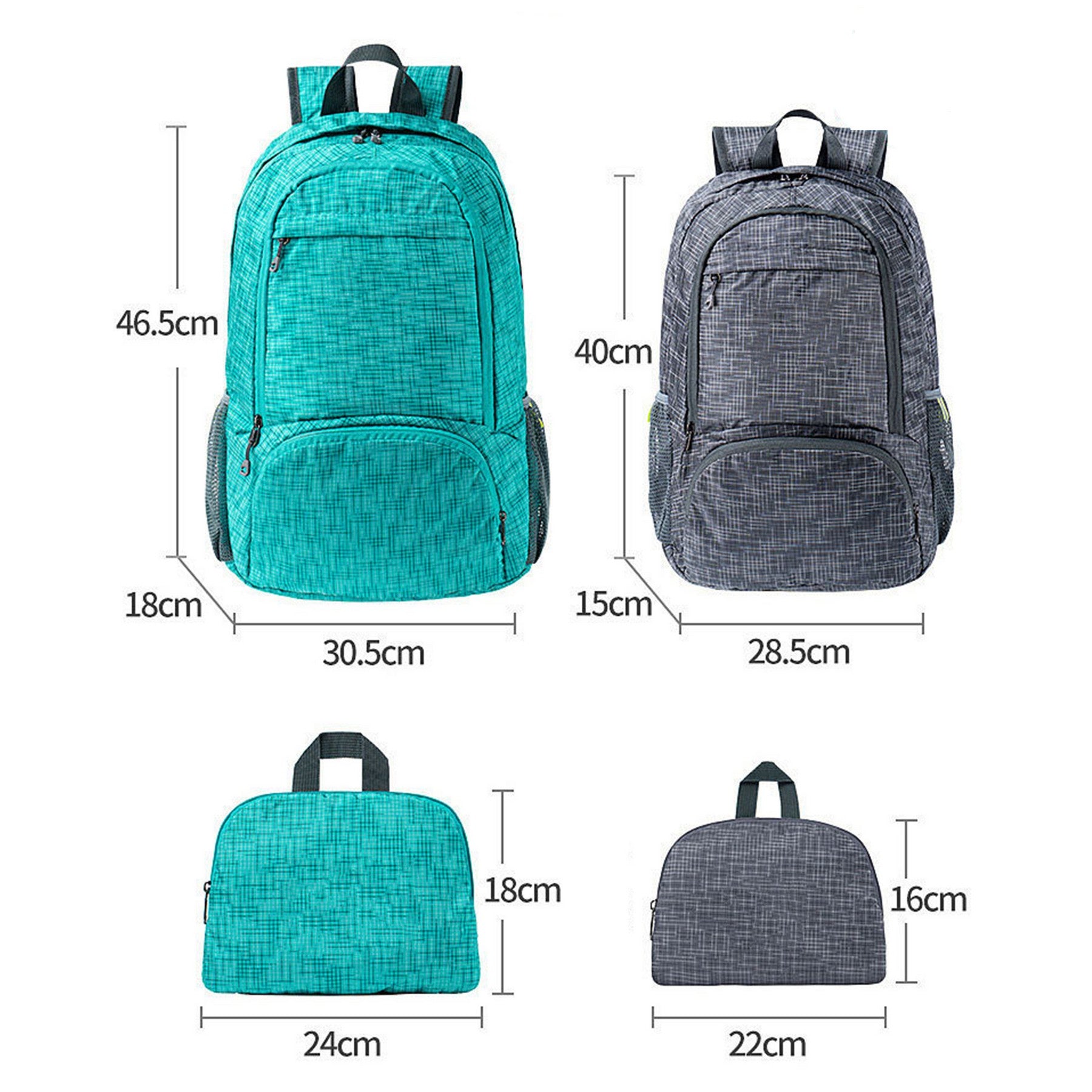 Hiking Daypack,Water Resistant Lightweight Packable Backpack for Travel Camping Outdoor. The backpack is about half of the weight of a phone. Easy to carry, can be folded into the wallet size fit into a pocket. This Foldable backpack provides enough space for outdoor travel, camping, hiking, day trips and shopping. Comes with a main zipper pocket, a front zipper pocket and two mesh side pockets. The main compartment provides enough storage space for day trips, hiking and shopping. 18.32" H x 12" W x 7" D