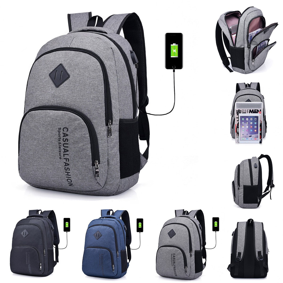 Made of waterproof nylon snow canvas, practical and easy to charge your phone with the USB connector. Zippered main compartment with padded laptop sleeve holds up to a notebook computer, dedicated iPad/tablet pocket with room for all your other business essentials. Front zippered pocket is large enough for power banks, cables, pens and notebooks. Side water bottle pocket. Top grab handle. Adjustable padded backpack straps.